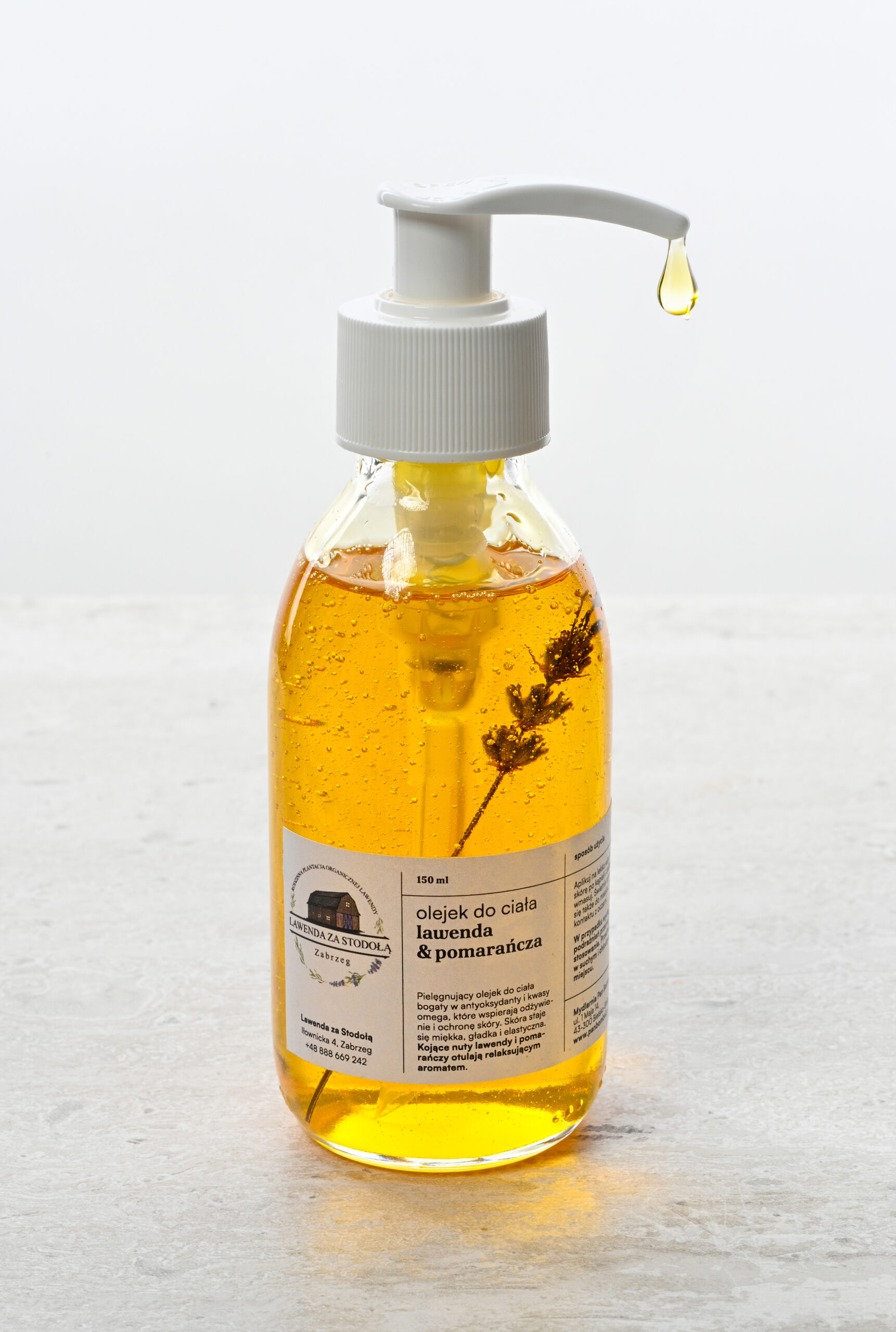 Olej do ciała lawenda-pomarańcza – ukojenie i zmysłowy relaks. Złocista esencja, która otula skórę niczym ciepły, letni zmierzch na naszej plantacji. Gdy tylko rozprowadzisz olej dłońmi, poczujesz, jak napięcie dnia ulatnia się wraz z